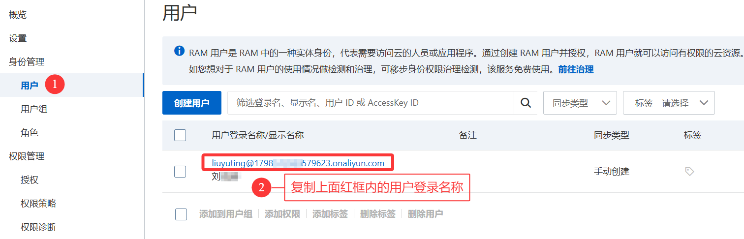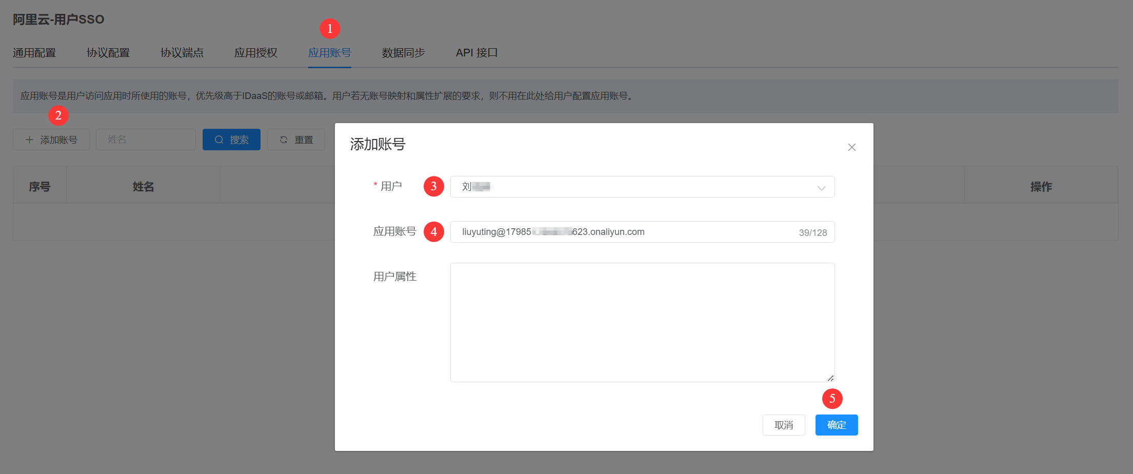 6.选择要登录阿里云的用户,并把步骤4.4中复制的用户登录名称粘贴到标号4的输入框中,完成账号映射。