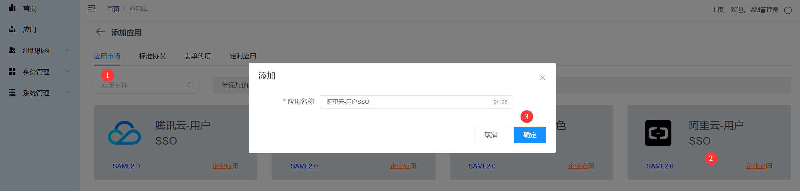 以管理员身份登录亿登 IDaaS,点击 设置 > 应用 > 创建应用 > 应用市场,搜索 阿里云-用户SSO,单击添加应用。