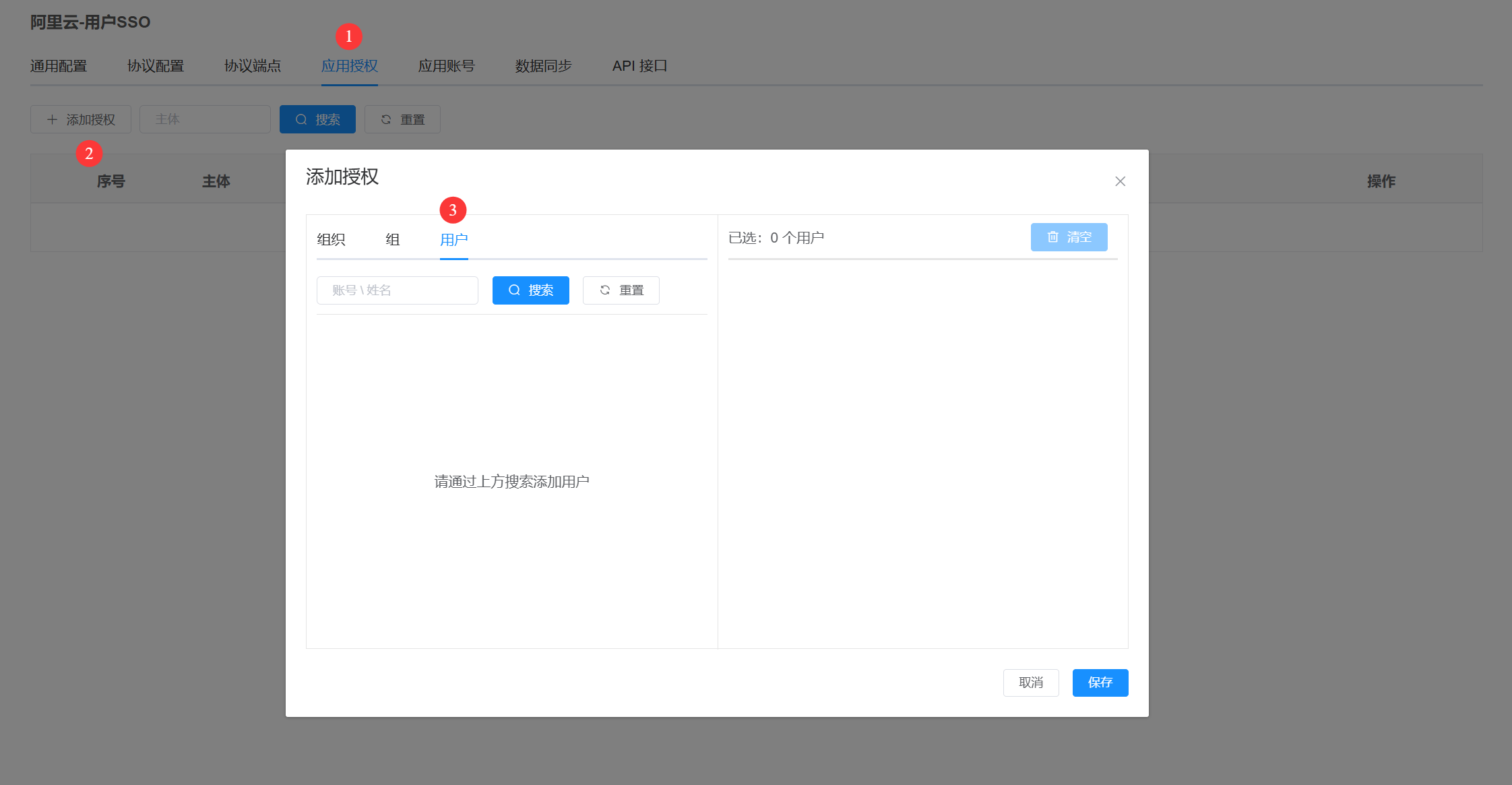 3.2 按下图标示搜索用户,给步骤1.1中创建的用户添加授权。