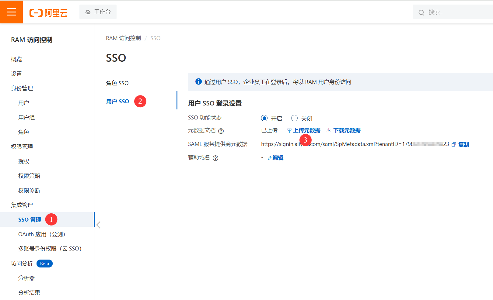 4.2 点击SSO管理 > 用户 SSO > 上传元数据,上传在步骤3.1中下载的元数据到阿里云RAM。