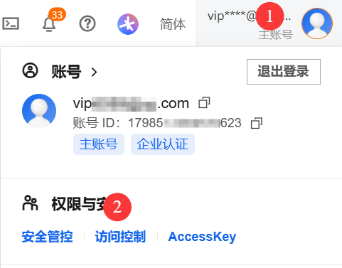3.1 登录阿里云后,按下图标示,点击右上角图像,选择访问控制。