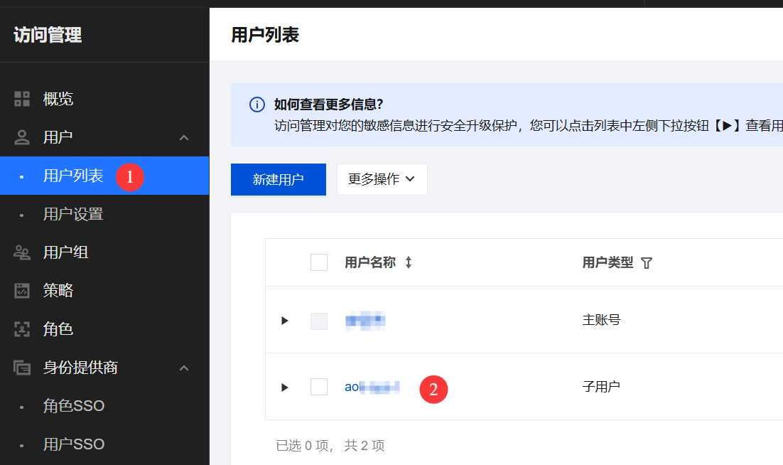 特别说明:下图中的用户类型,主账号不支持单点登录,必须是子用户才支持SSO。