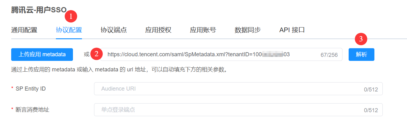 4.把步骤3.3中复制的【SAML 服务提供商元数据 URL】粘贴到标号2的输入框中,然后点击解析按钮,即可自动填充 SP Entity ID 和 断言消费地址。