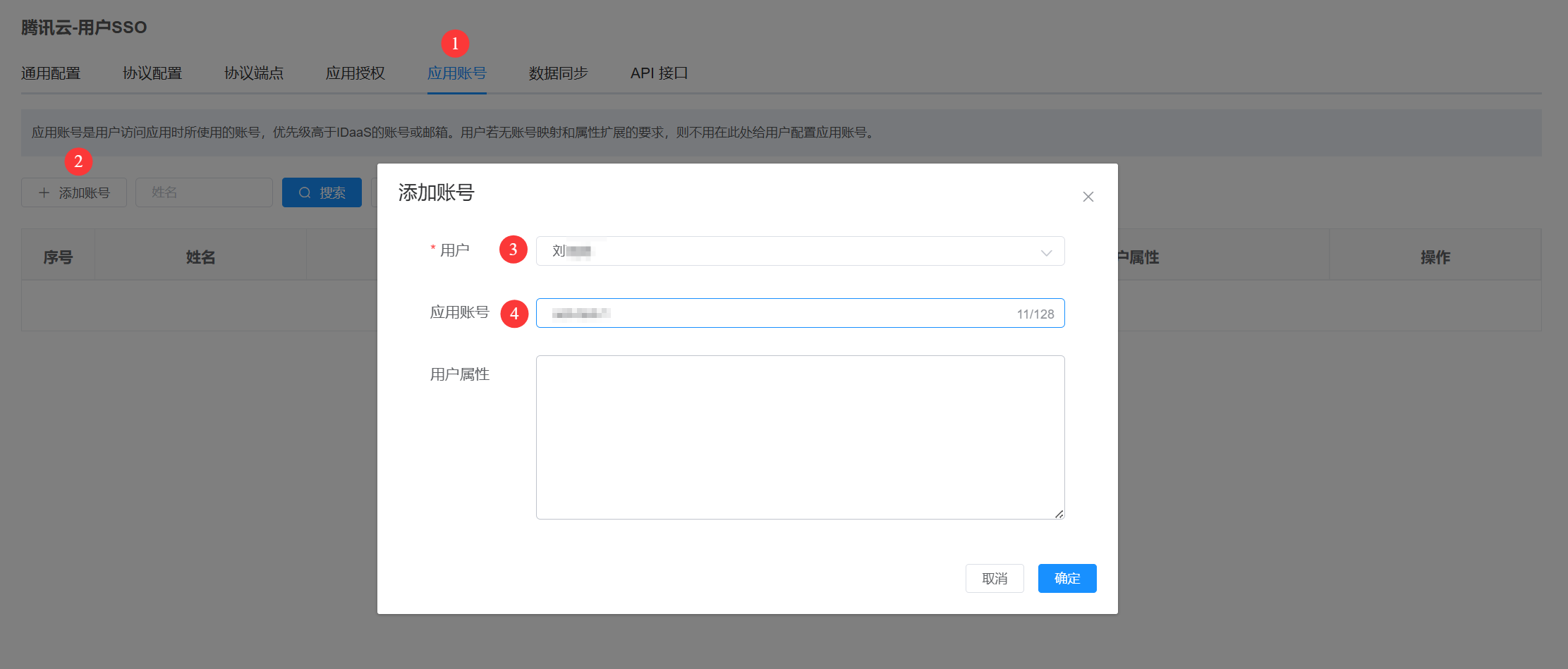 5.选择要登录腾讯云的用户,并把步骤3.5中复制的用户名称粘贴到标号4的输入框中,完成账号映射。