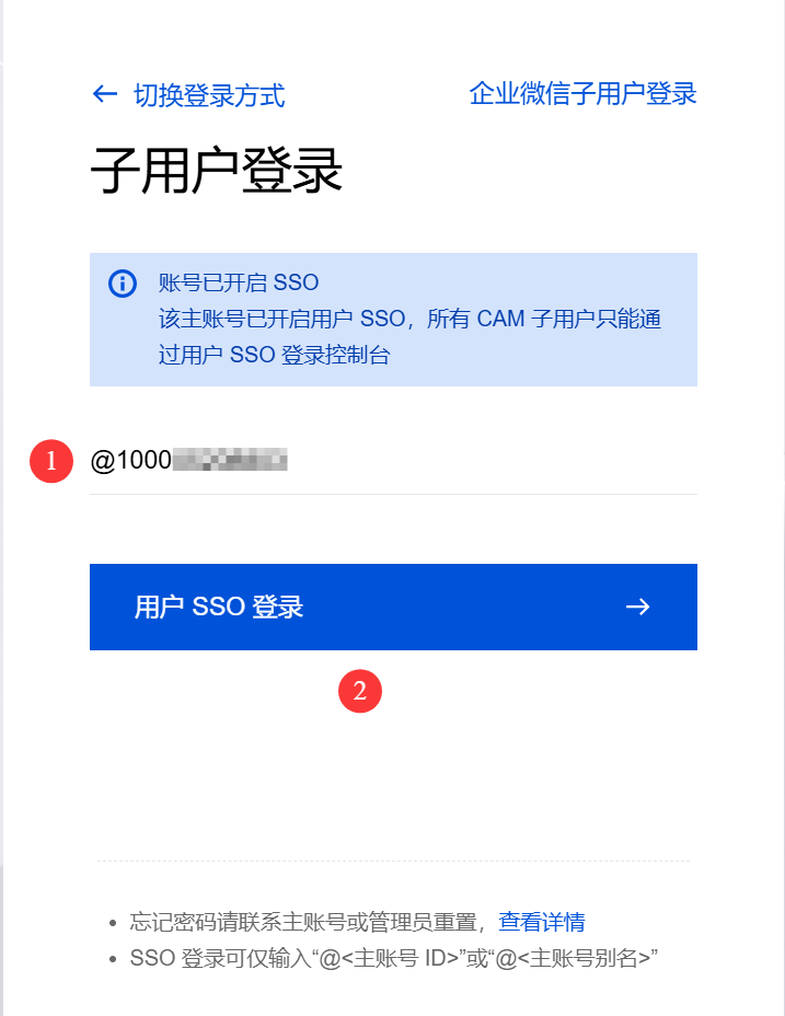 图2:在下图标示1的地方输入@主账号(主账号前必须先输入@符号),点击 用户 SSO 登录 按钮。