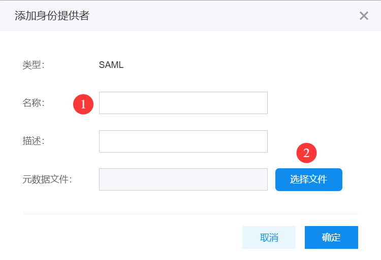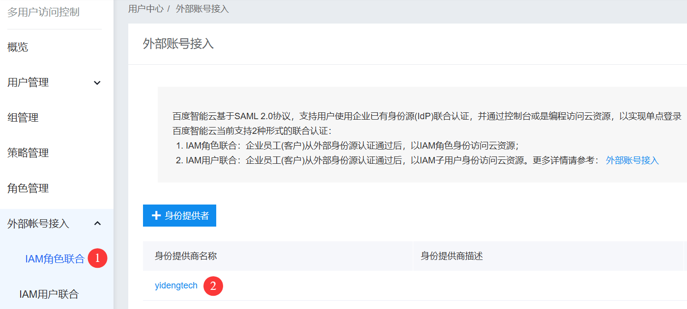 3.3 在多用户访问控制页面中,点击 外部账号接入 > IAM 角色联合 > 身份提供者,输入名称,并上传在2.1步骤中下载的元数据文件。
