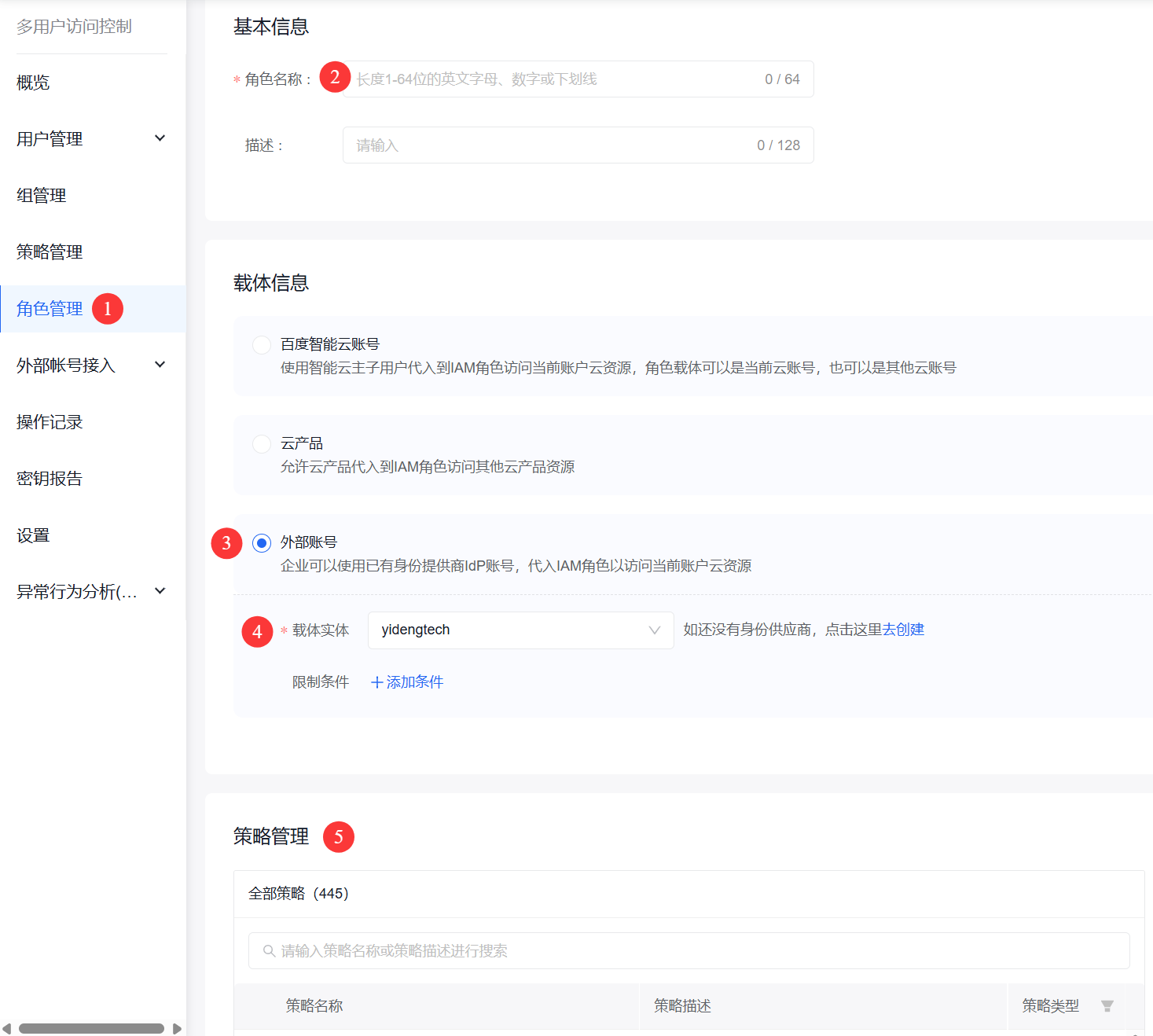 3.使用主账号登录百度智能云,创建角色并分配角色权限。