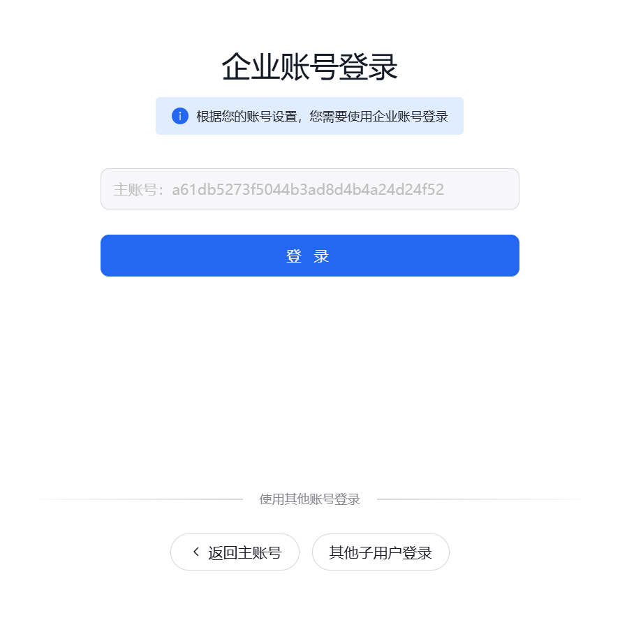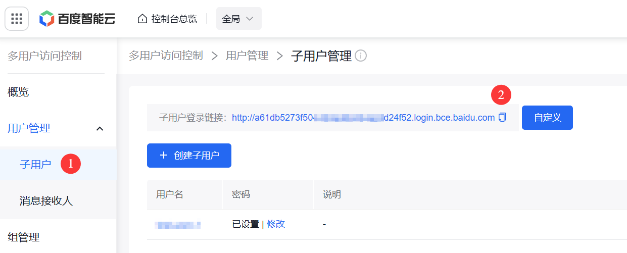 在浏览器中访问 子用户登录链接,打开子用户登录页。此链接在 多用户访问控制 > 用户管理 > 子用户 页面中获取,具体请参考下图1。