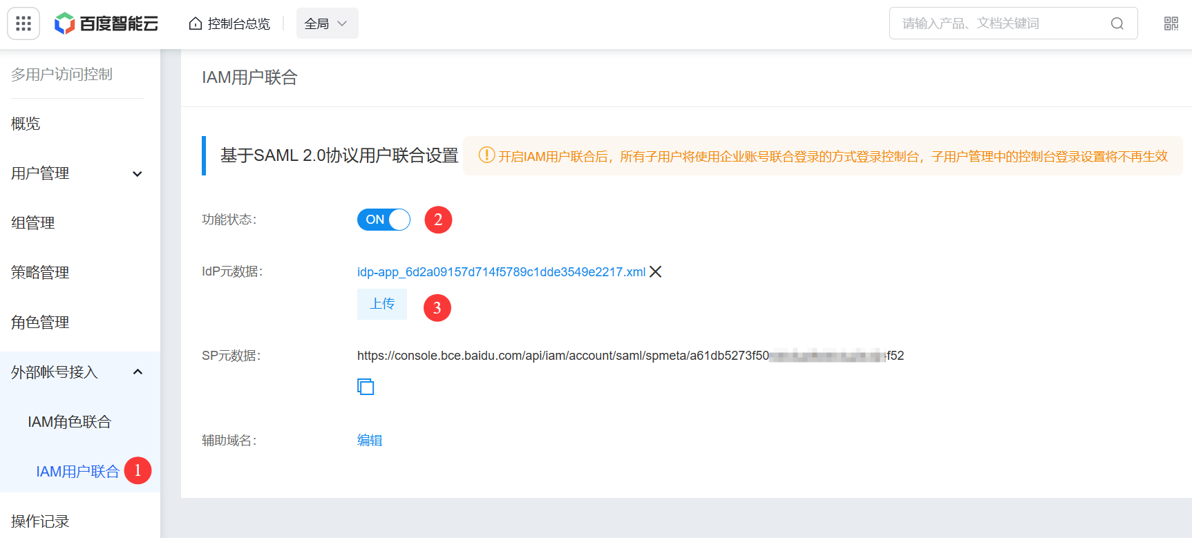 3.3 点击 外部账号接入 > IAM 用户联合,打开功能状态,上传在步骤2.1中下载的元数据。