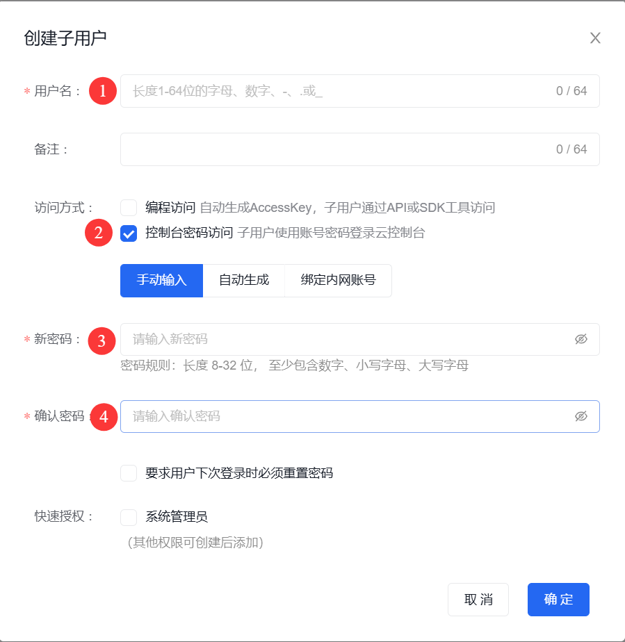 3.5 点击 用户管理 > 子用户 > 创建子用户,并按要求填写表单,用户名推荐设置为和IDaaS中的账号一致。