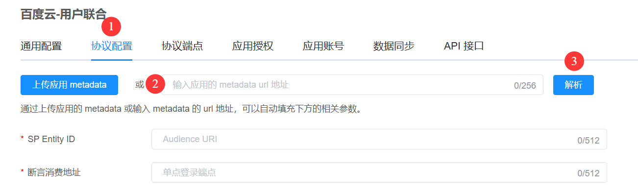 4.在IDaaS侧,把步骤3.3中复制的【SP元数据】URL 粘贴到标号2的输入框中,然后点击解析按钮,即可自动填充 SP Entity ID 和 断言消费地址。