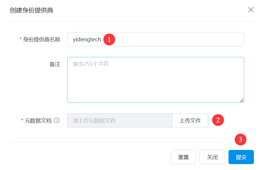 3.2 点击SSO管理 > 角色 SSO > 新建身份提供商,输入身份提供商名称,上传在2.1步骤中下载的元数据文档。