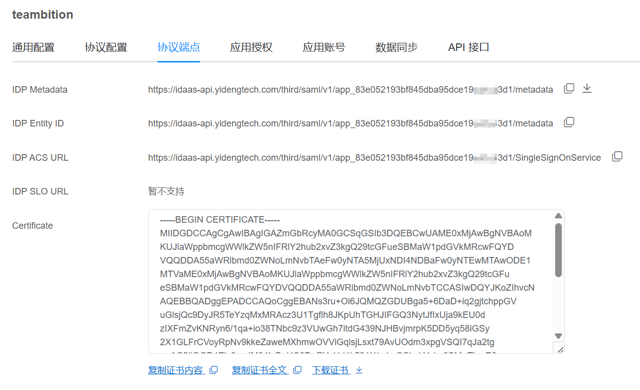 2.1 创建应用后,点击 协议端点 页签,可以看到后续用于配置Teambition的各种参数。
