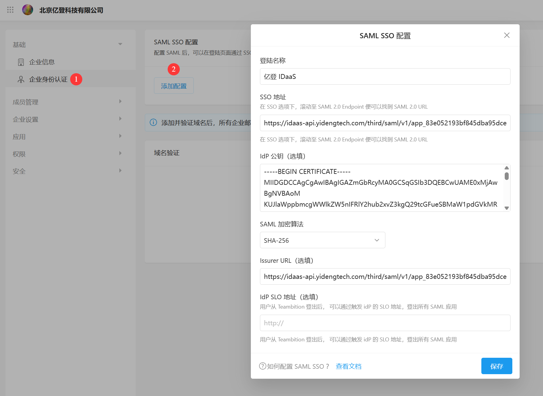 3.2 点击 企业身份认证 > 添加配置,在弹出框中参考下图完成配置。