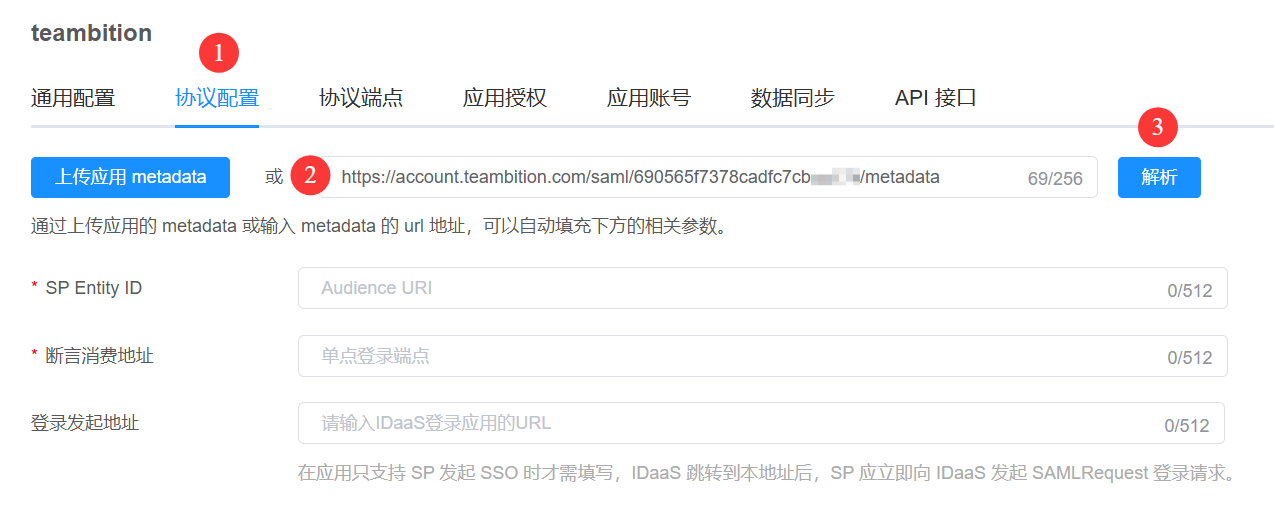 4.把步骤3.3中复制的【Metadata 地址】粘贴到标号2的输入框中,然后点击解析按钮,即可自动填充 SP Entity ID 和 断言消费地址。