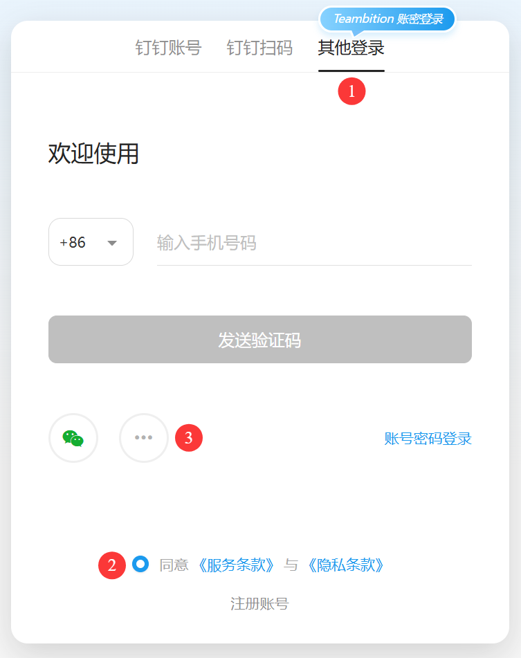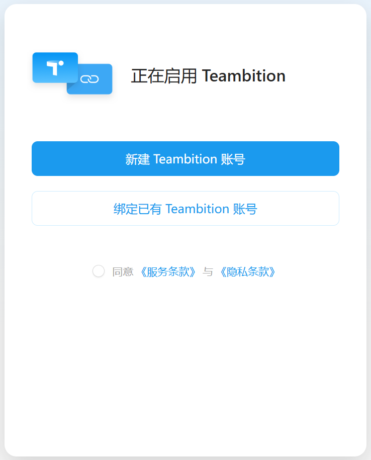 图2:如果是首次登录,Teambition会要求用户绑定账号,如果用户没有Teambition账号,可以点击 新建 Teambition 账号;已有Teambtion账号,点击绑定已有 Teambition 账号。