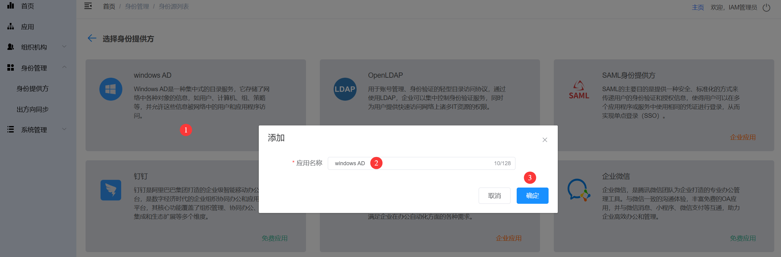 1.点击 身份管理 > 身份提供方 > 添加身份提供方,在选择身份提供方的界面中点击windows AD,在弹出框中输入应用名称后点击确定后完成创建。