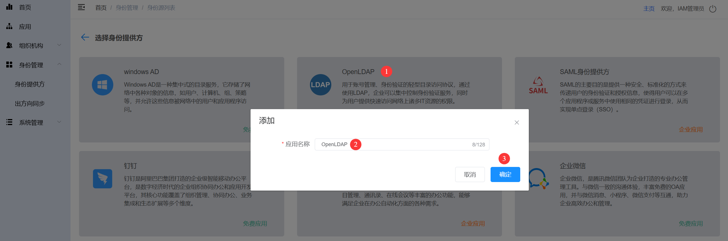 1.点击 身份管理 > 身份提供方 > 添加身份提供方,在选择身份提供方的界面中点击OpenLDAP,在弹出框中输入应用名称后点击确定后完成创建。