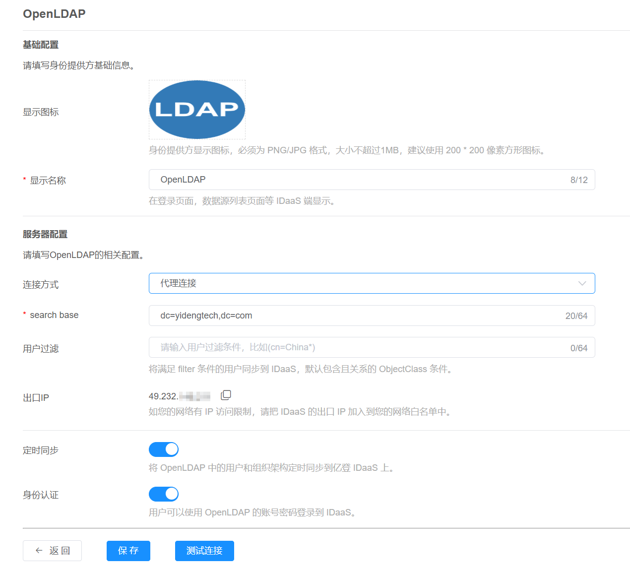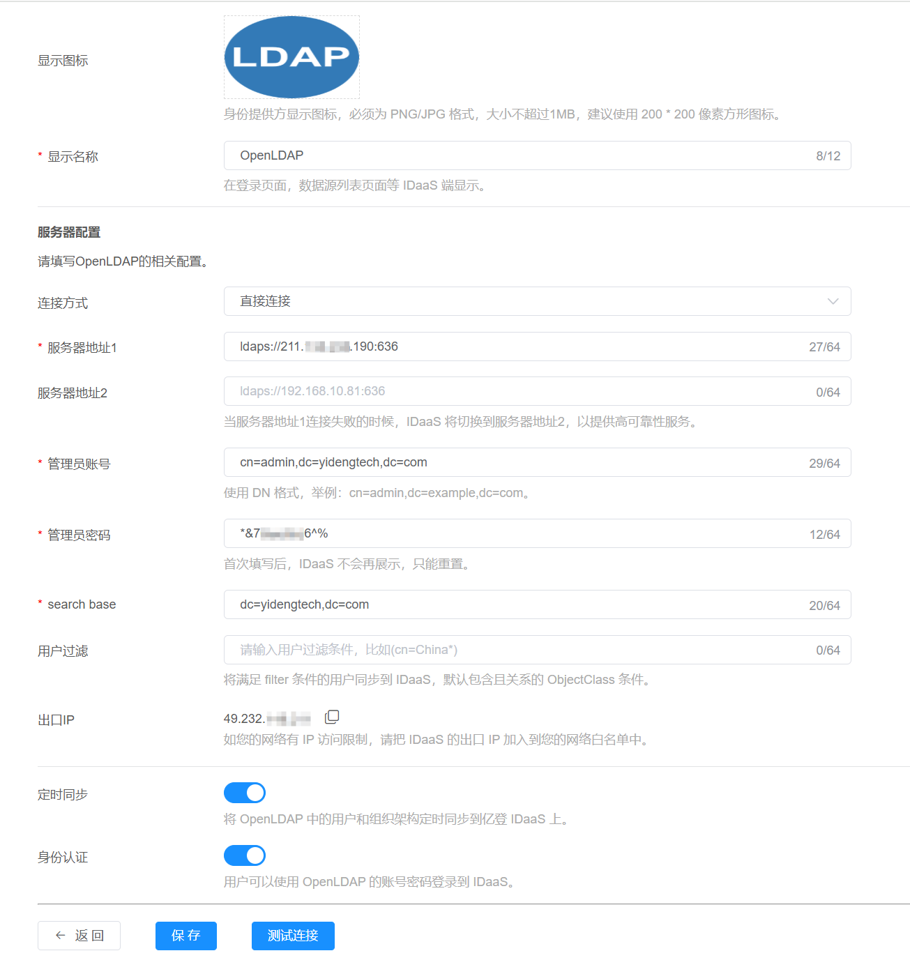 直接连接:需要提供公网IP,让IDaaS连接到OpenLDAP。