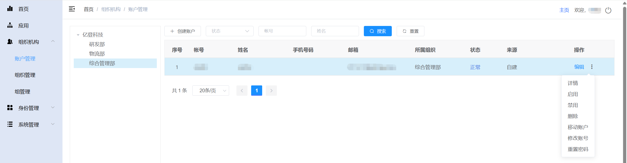 管理员在创建账户时,点击左侧组织树中选择的组织,在创建页面不可直接编辑。