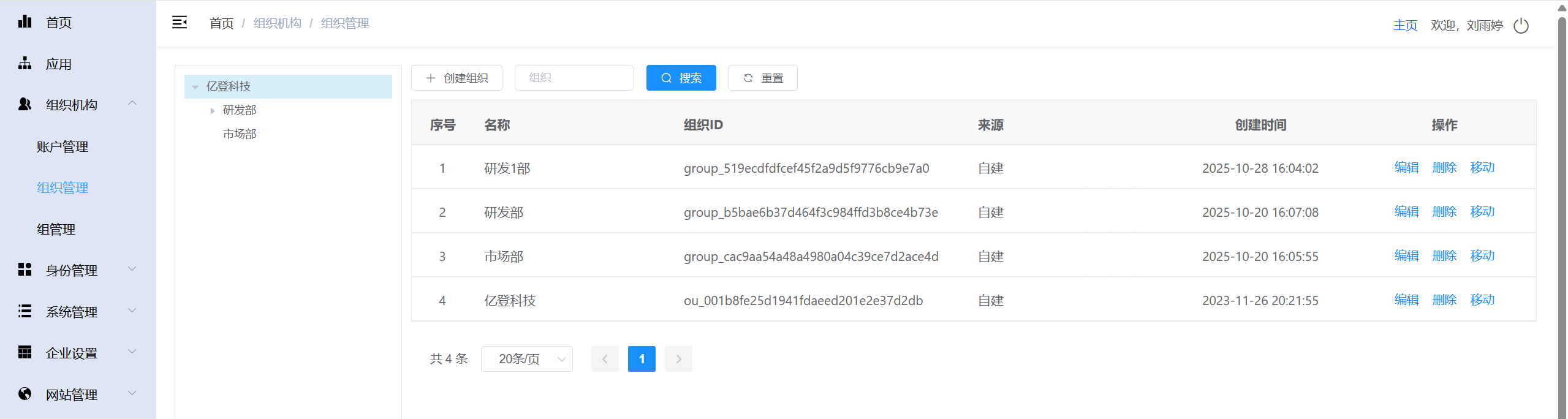 通过以上方式创建的组织,最终都会汇集到IDaaS的组织管理中,供管理员进行统一的管理和授权。