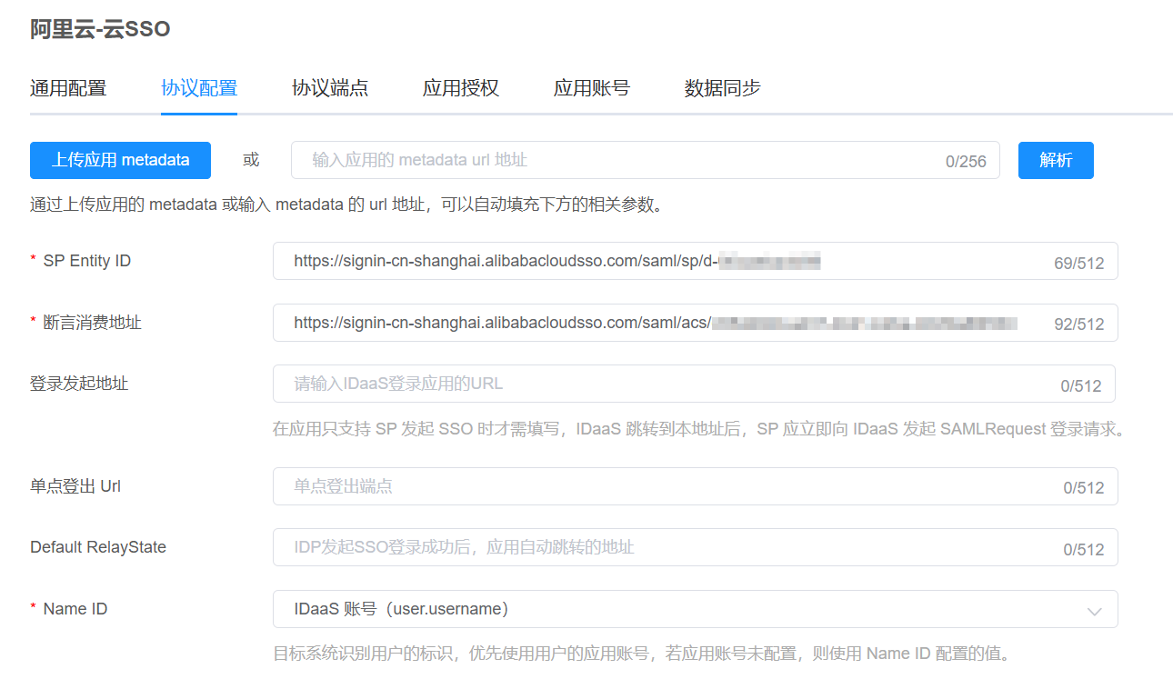 Name ID:选 IDaaS 账号,请 确保 IDaaS 账户名与阿里云云 SSO 的用户名一致,否则要做应用账号的映射。