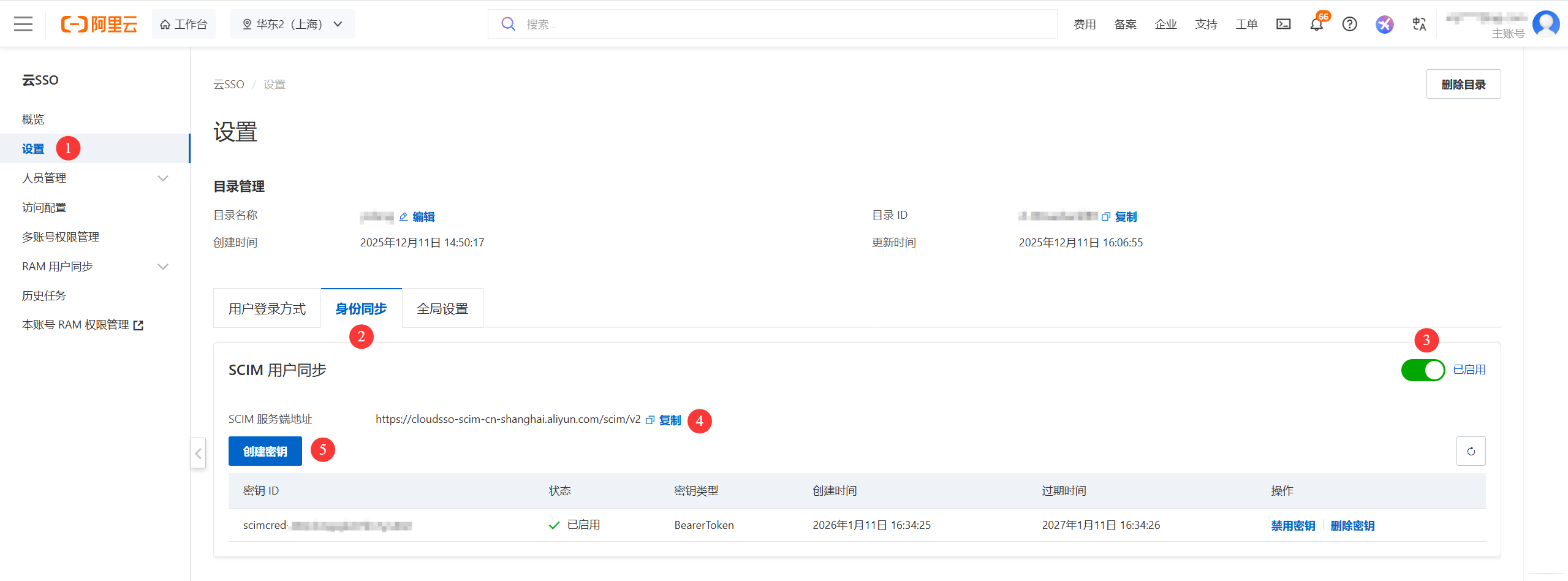 1.参考下图创建密钥。序号4的 SCIM 服务端地址,在下面的步骤3中会用到。