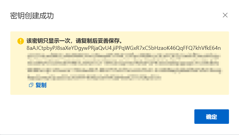 特别说明:密钥只显示一次,以后无法再次查看,复制后请妥善保存