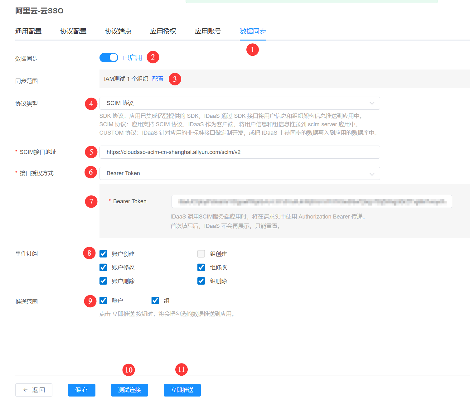配置完成后,可以点击 测试连接 按钮,验证配置的正确性。立即推送 按钮可以把同步范围内的账户和组推送到阿里云云 SSO 。