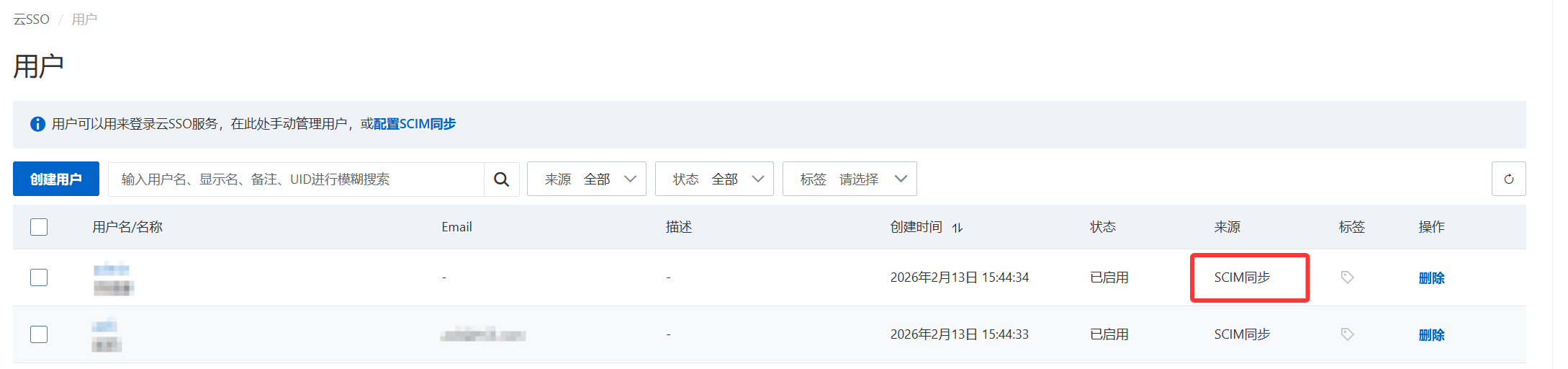 4.2 阿里云-云 SSO 侧验证。查看用户列表和用户组的数据,创建方式列会显示为同步。