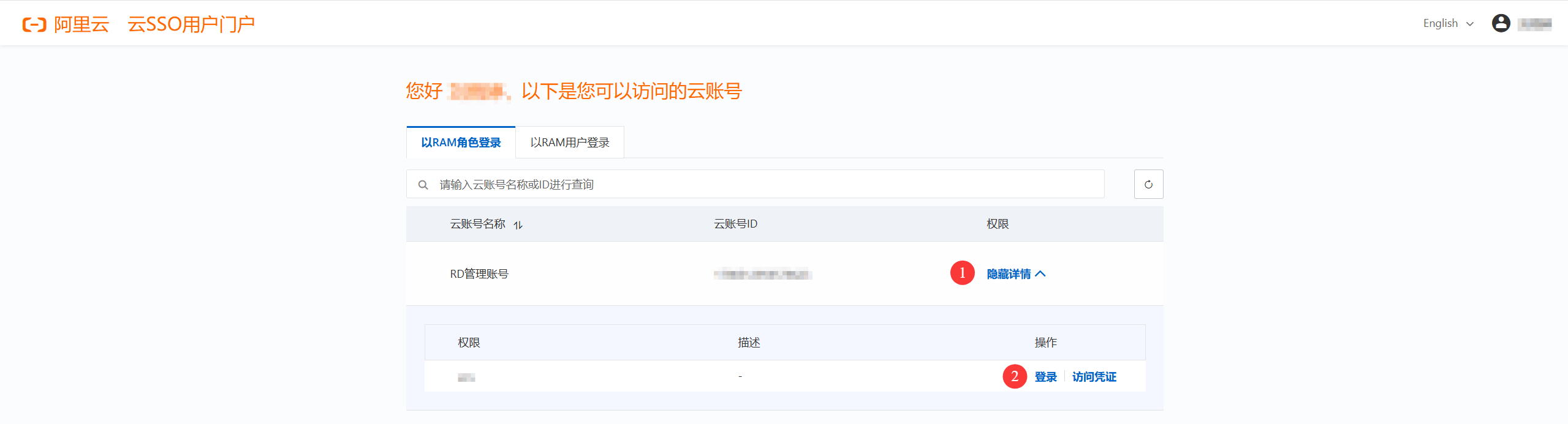 在 IDaaS 主页中,点击 阿里云-云 SSO 图标,将跳转到云 SSO 用户门户,点击序号2处的登录即可进入阿里云控制台。