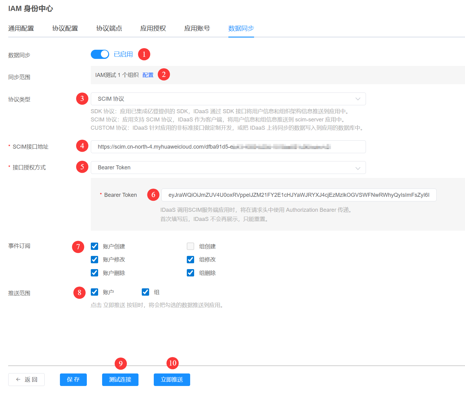 配置完成后,可以点击 测试连接 按钮,验证配置的正确性。立即推送 按钮可以把同步范围内的账户和组推送到华为云IAM身份中心。