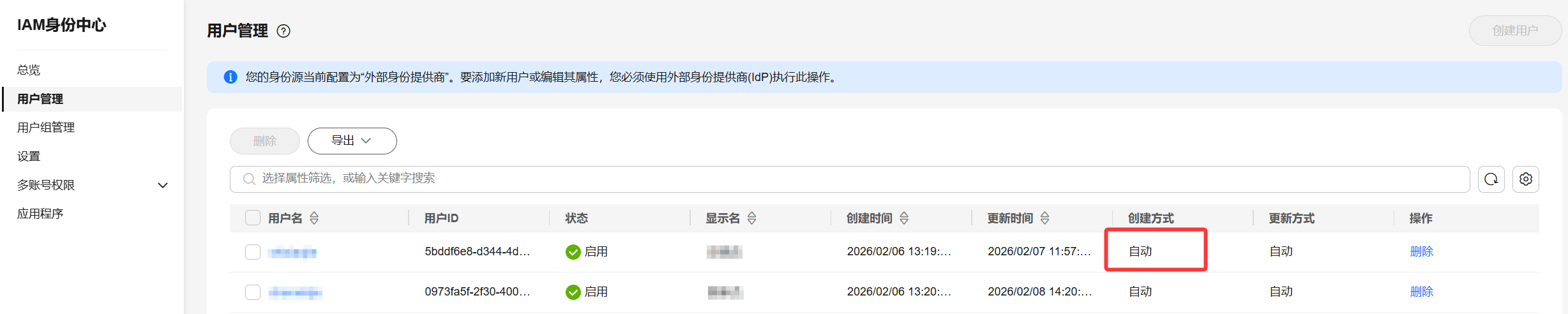 4.2 华为云 IAM 身份中心侧验证。查看用户和用户组的数据,创建方式列会显示为自动。
