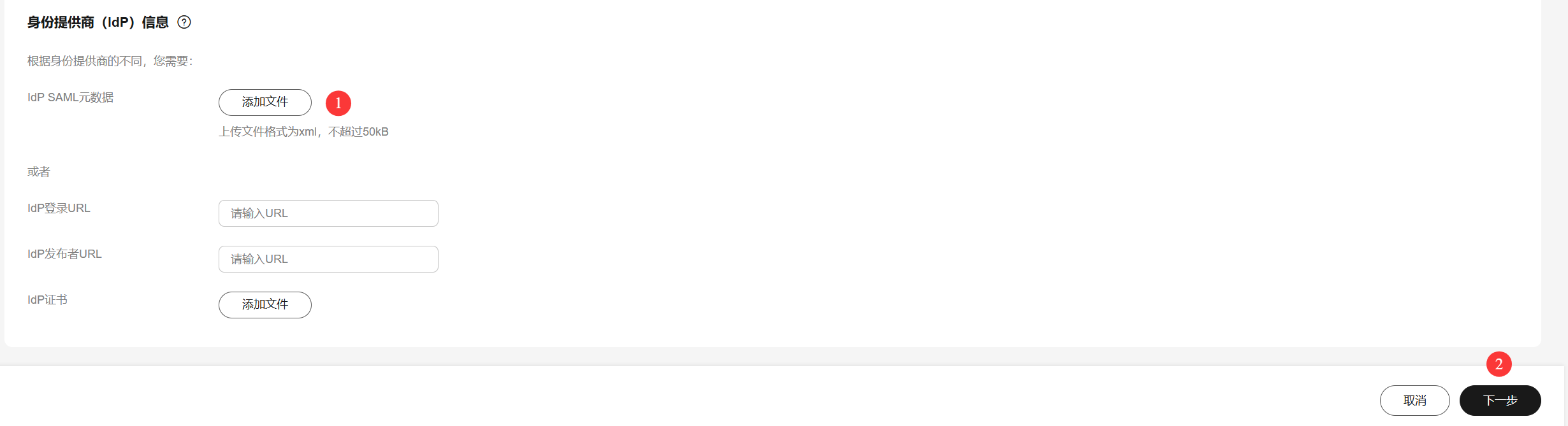 3.3 上传步骤2.2中序号2下载的 IDP Metadata,并点击下一步