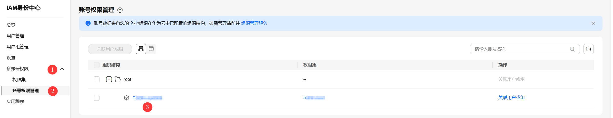 3.5 单击序号3处的组织架构,在组织的 基本信息 页面中,根据您的实际情况给用户/组分配权限集。