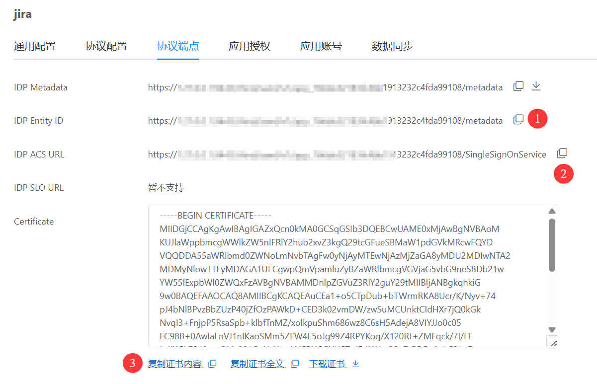 2.2 点击 协议端点 页签,这是用于配置 jira 单点登录的参数,在后续步骤中会用到。