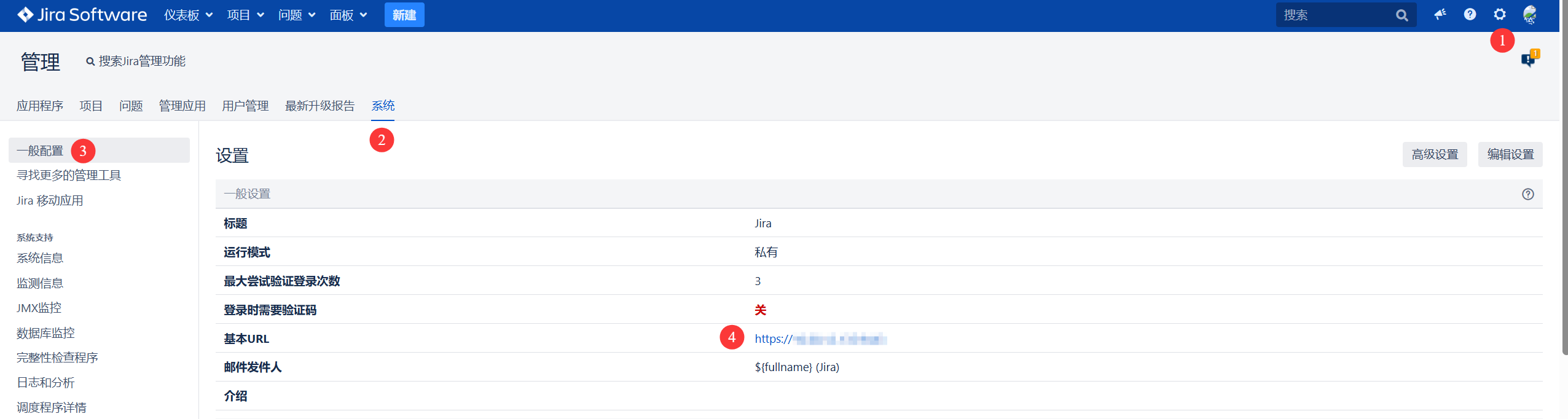 3.1 点击 右上角管理图标,选择 系统 > 一般配置,检查 基本 URL 使用的是否 https 协议,如果是 http 必须先配置 https 协议。