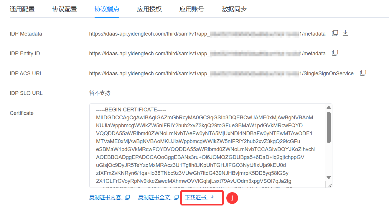 2.1 创建应用后,点击 协议端点 页签,找到 Certificate,并点击下载证书按钮保存到本地,将文件名 public.cer 修改为 idp.crt。